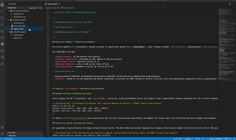 The Autype VS Code Extension lets you write reports, papers, invoices, API docs, and any other document using an extended Markdown syntax. Render a live PDF preview side-by-side with your editor, then export to PDF, DOCX, or ODT with a single click. Free to use — sign up at app.autype.com and get your API key in seconds.Demo